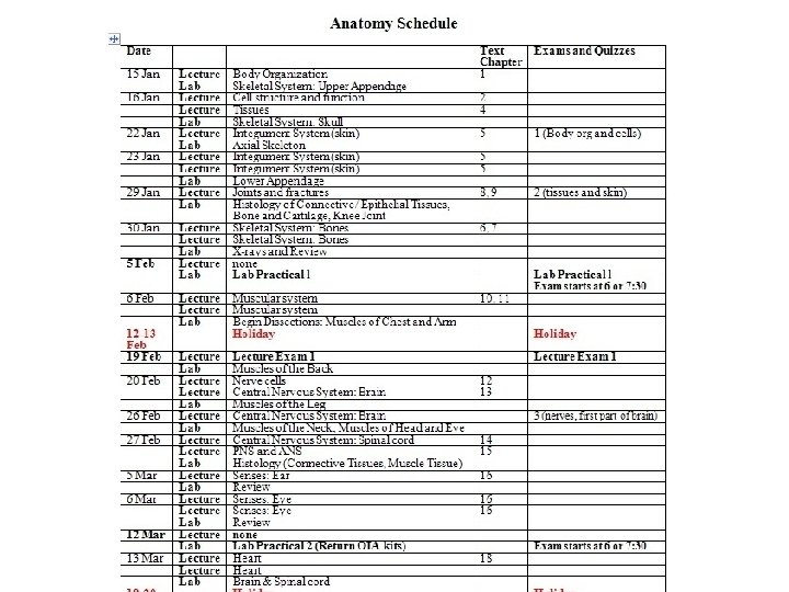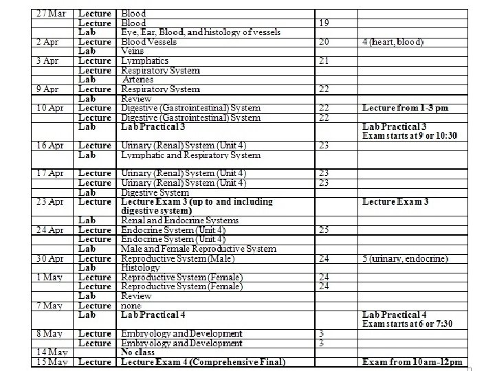 Anatomy Schedule This is a projected schedule, and is subject to change. It is your responsibility to stay informed. Last date to withdraw without a W: Around February 18 Last date to withdraw with a W: Around April 8