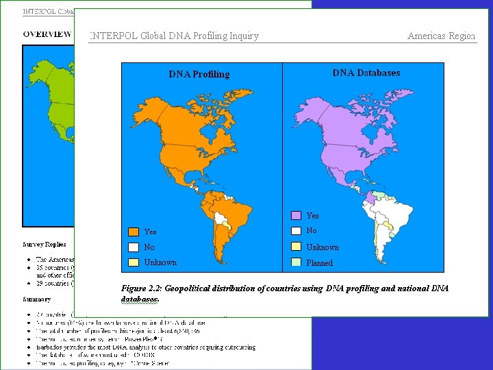 Conclusion Edit New 2009 in As of the end of 2008 based on the information obtained from 172 INTERPOL member countries: 120 countries using DNA profiling in criminal investigations 54 countries with a national DNA database At least 16, 448, 936 DNA profiles Majority of countries reported to use FBI-CODIS software for their national DNA databases A majority of the 54 countries with a current national DNA database have implemented databasespecific DNA database legislation (28 countries) The United States of America has the largest national DNA database with at least 6, 702, 743 profiles ‘Crime Scene’ is the most predominantly used profiling category, however, ‘Reference’ profiles equal 92% of the global total profiles 27 member countries outsource their DNA sample analysis Identifiler, used the most in two of the five global regions (Asia & South Pacific and North Africa & Middle East) is the most predominantly used marker system The benefits of DNA profiling at a national level are recognized by all countries using, or planning to use DNA profiling as a forensic technique.