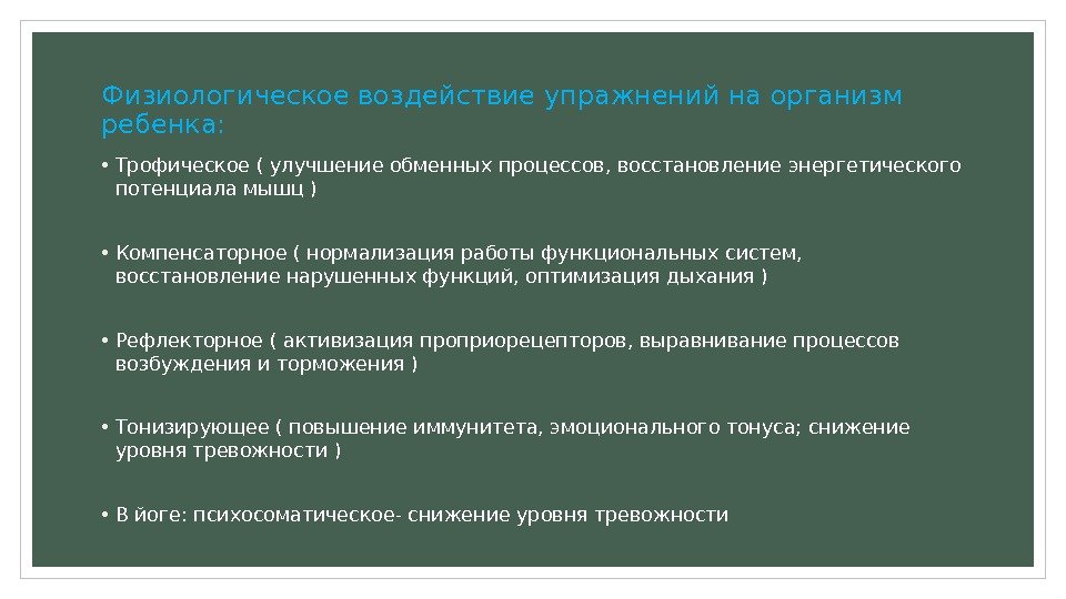Физиологическое воздействие упражнений на организм ребенка: • Трофическое ( улучшение обменных процессов, восстановление энергетического потенциала мышц ) • Компенсаторное ( нормализация работы функциональных систем, восстановление нарушенных функций, оптимизация дыхания ) • Рефлекторное ( активизация проприорецепторов, выравнивание процессов возбуждения и торможения ) • Тонизирующее ( повышение иммунитета, эмоционального тонуса; снижение уровня тревожности ) • В йоге: психосоматическое- снижение уровня тревожности