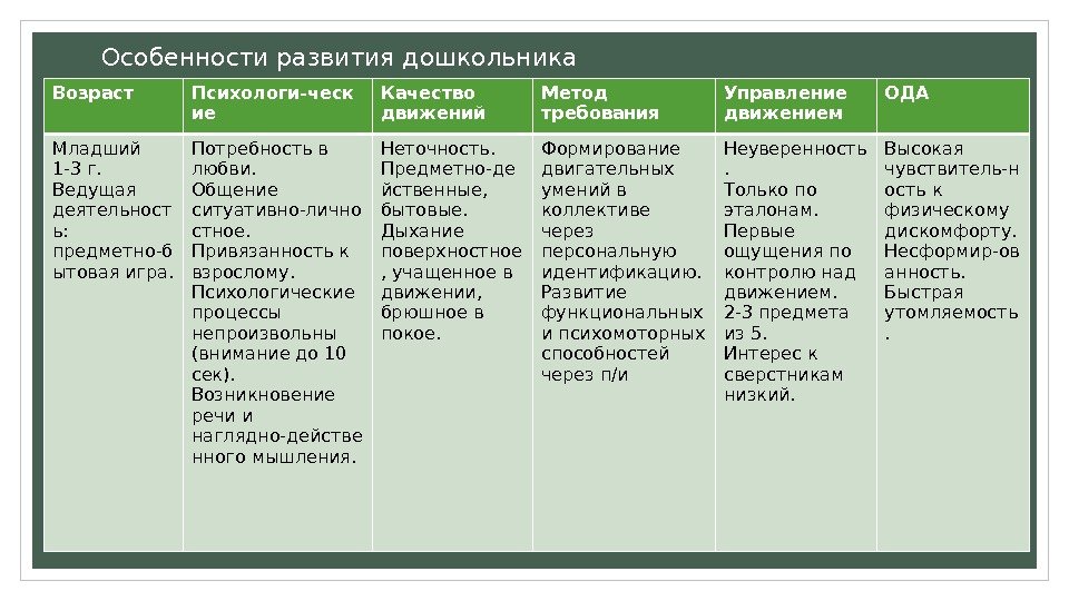 Особенности развития дошкольника Возраст Психологи-ческ ие Качество движений Метод требования Управление движением ОДА Младший 1 -3 г. Ведущая деятельност ь: предметно-б ытовая игра. Потребность в любви. Общение ситуативно-лично стное. Привязанность к взрослому. Психологические процессы непроизвольны (внимание до 10 сек). Возникновение речи и наглядно-действе нного мышления. Неточность. Предметно-де йственные, бытовые. Дыхание поверхностное , учащенное в движении, брюшное в покое. Формирование двигательных умений в коллективе через персональную идентификацию. Развитие функциональных и психомоторных способностей через п/и Неуверенность. Только по эталонам. Первые ощущения по контролю над движением. 2 -3 предмета из 5. Интерес к сверстникам низкий. Высокая чувствитель-н ость к физическому дискомфорту. Несформир-ов анность. Быстрая утомляемость.