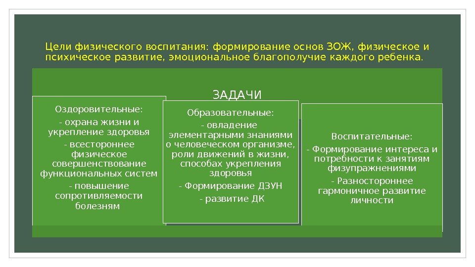 Цели физического воспитания: формирование основ ЗОЖ, физическое и психическое развитие, эмоциональное благополучие каждого ребенка. ЗАДАЧИ Оздоровительные: — охрана жизни и укрепление здоровья — всестороннее физическое совершенствование функциональных систем — повышение сопротивляемости болезням Образовательные: — овладение элементарными знаниями о человеческом организме, роли движений в жизни, способах укрепления здоровья — Формирование ДЗУН — развитие ДК Воспитательные: — Формирование интереса и потребности к занятиям физупражнениями — Разностороннее гармоничное развитие личности