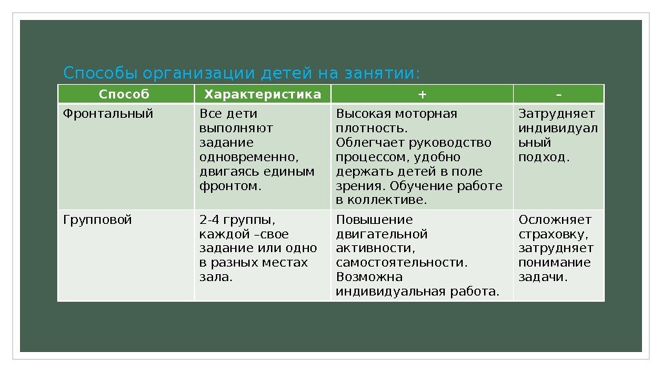 Способы организации детей на занятии: Способ Характеристика + – Фронтальный Все дети выполняют задание одновременно, двигаясь единым фронтом. Высокая моторная плотность. Облегчает руководство процессом, удобно держать детей в поле зрения. Обучение работе в коллективе. Затрудняет индивидуал ьный подход. Групповой 2 -4 группы, каждой –свое задание или одно в разных местах зала. Повышение двигательной активности, самостоятельности. Возможна индивидуальная работа. Осложняет страховку, затрудняет понимание задачи.