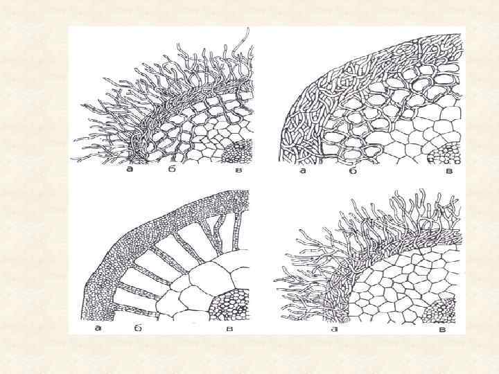 Микориза • Эктотрофная, когда гриб оплетает кончики корней растений наподобие чехла, отдельные гифы при этом заходят между клетками эпидермиса, где образуют так называемую «сеть Гартига» ;
