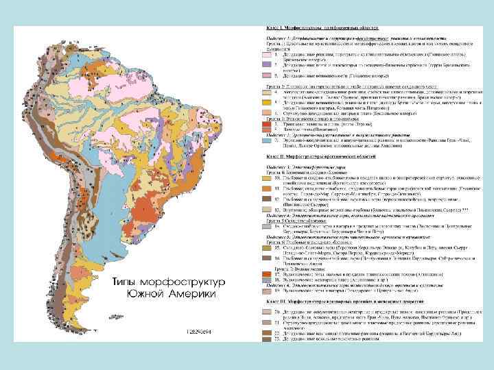 Морфоструктуры Южной Америки • III. Горы эпигеосинклинальных областей • А. Горы и нагорья на кайнозойском складчатом основании • Сводово-блоково-складчатые (Карибские Анды) • Складчатые и складчато-блоковые горы кайнозойского возраста (Кордильера Колумбии, Береговая кордильера) • Горст-интрузивные хребты и массивы (Кордильера Бланка, Береговая Кордильера) • Вулканические плато, нагорья и горы (Центрально. Андийское нагорье, Западная Кордильера Перу) • Б. Горы и нагорья новейшей активизации на разновозрастном складчатом основании • Блоково-складчатые хребты на мезозойском