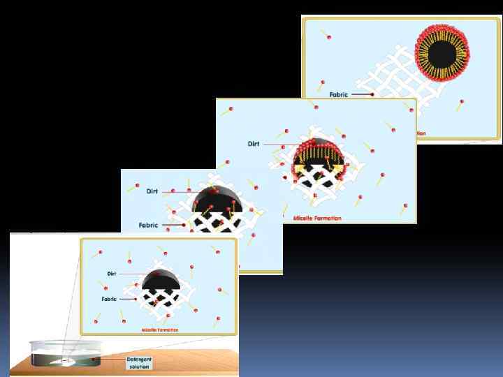 Моющее действие ПАВ обусловлено комплексом коллоидно-химических процессов, включающим: улучшение смачивания - в присутствии ПАВ снижается поверхностное натяжение на границе загрязнение — раствор, что способствует преодолению сил адгезии и отрыву загрязнения от поверхности; диспергирование загрязнений -пептизация крупных частиц твердой фазы и эмульгирование нерастворимых в воде жидкостей.