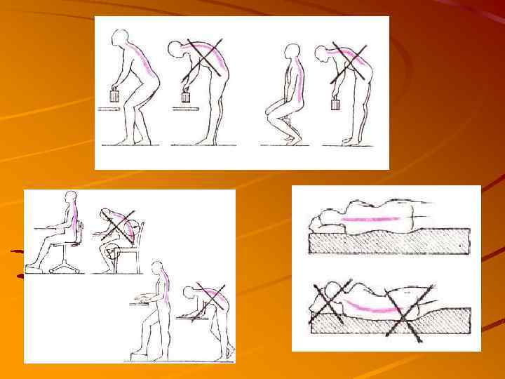 Занятия полезные для позвоночника Плавание; Ходьба; Катание на лыжах; Силовая тренировка. Занятия вредные для позвоночника • Спортивные игры с резкими стартами и остановками;