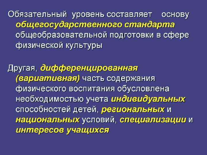 Содержание физического воспитания в общеобразовательной школе Основное средство овладения физической культурой – освоение базовых ее основ – объективно необходимого для каждого человека обязательного уровня физической культуры, без которого невозможно эффективное осуществление жизнедеятельности вне зависимости от того, чем бы хотел заниматься человек в будущем