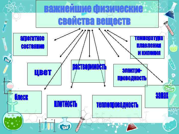 Физические свойства вещества – свойства, проявляемые веществом в процессах, при которых вещество остается химически неизменным. Примерами физических свойств являются форма, окраска, запах, растворимость, температура плавления, плотность.