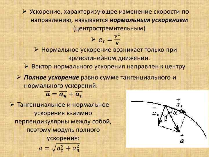• Ускорение, характеризующее изменение скорости по модулю называется тангенциальным ускорением. Ø Тангенциальное ускорение направлено всегда по касательной к траектории, вдоль направления скорости: ü если движение равноускоренное, то тангенциальное ускорение совпадает по направлению скорости, ü если движение равнозамедленное, то противоположно направлено вектору скорости