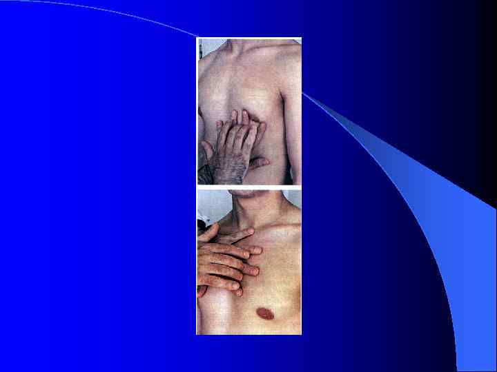 Осмотр и пальпация области сердца (видимые глазом и ощущаемые пальцем различные пульсации) l l l l l Верхушечный толчок Сердечный толчок (3 -4 м/р у края грудины) в норме не определяется Эпигастральная пульсация –характерна для гипертрофии и дилатации правого желудочка Пульсация сонных артерий ( «пляска каротид» ) Пульсация в яремной вырезке (аорта, аневризма аорты) Пульсация во 2 межреберье справа (аорта) Пульсация в 2 межреберье слева (легочная артерия) Пульсация в области 3 -4 ребер у левого края грудины (аневризма сердца) - 8 возможных симптомов