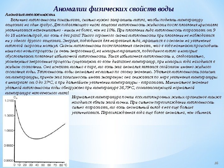 Аномалии физических свойств воды Аномалия теплоемкости. Величина теплоемкости показывает, сколько нужно затратить тепла, чтобы поднять температуру вещества на один градус. Для подавляющего числа веществ теплоемкость жидкости после плавления кристалла увеличивается незначительно — никак не более, чем на 10%. При плавлении льда теплоемкость возрастает от 9 до 18 кал/моль/град, то есть в два раза! Такого огромного скачка теплоемкости при плавлении не наблюдается ни у одного другого вещества. Энергия, подводимая для нагревания льда, тратится в основном на увеличение тепловой скорости молекул. Скачок теплоемкости после плавления означает, что в воде начинают происходить какие-то новые процессы (и очень энергоемкие), на которые тратится, подводимое тепло и которые обусловливают появление избыточной теплоемкости. Такая избыточная теплоемкость и, следовательно, упомянутые энергоемкие процессы существуют во всем диапазоне температур, при которых вода находится в жидком состоянии. Она исчезает только в паре, то есть эта аномалия является свойством именно жидкого состояния воды. Теплоемкость воды аномальна не только по своему значению. Удельная теплоемкость зависит от температуры, причем эта зависимость имеет экстремум: она снижается по мере увеличения температуры в интервале от 0 до 37 o С, а при дальнейшем увеличении температуры — возрастает. Минимальное значение удельной теплоемкости воды обнаружено при температуре 36, 79 o С, соответствующей нормальной температуре человеческого тела! Нормальная температура почти всех теплокровных живых организмов также находится вблизи этой точки. При сильном переохлаждении теплоемкость сильно возрастает, то есть аномальный вклад в нее еще больше увеличивается. Переохлажденная вода еще более аномальна, чем обычная.