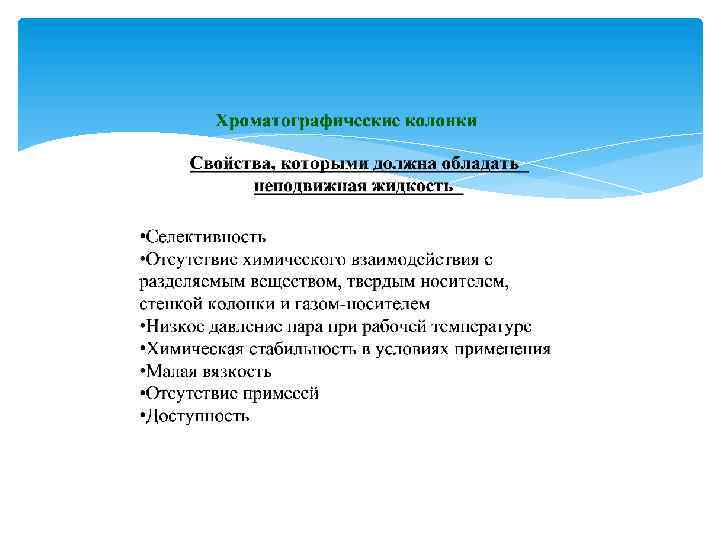 Хроматографические колонки Капиллярные колонки выполняются из нержавеющей стали, стекла, кварца; внутренний диаметр 0, 25 -0, 50 мм; длина 10 (20) – 100 (200) м. Неподвижная фаза в виде тонкой пленки нанесена на внутренние стенки колонки, то есть колонка остается полой. Поток газа движется в колонке с большой линейной скоростью, не встречая значительного сопротивления. Поэтому для обеспечения необходимых расходов газа-носителя через капиллярную колонку оказывается достаточным примерно такое же входное давление, что и при работе с насадочными колонками.