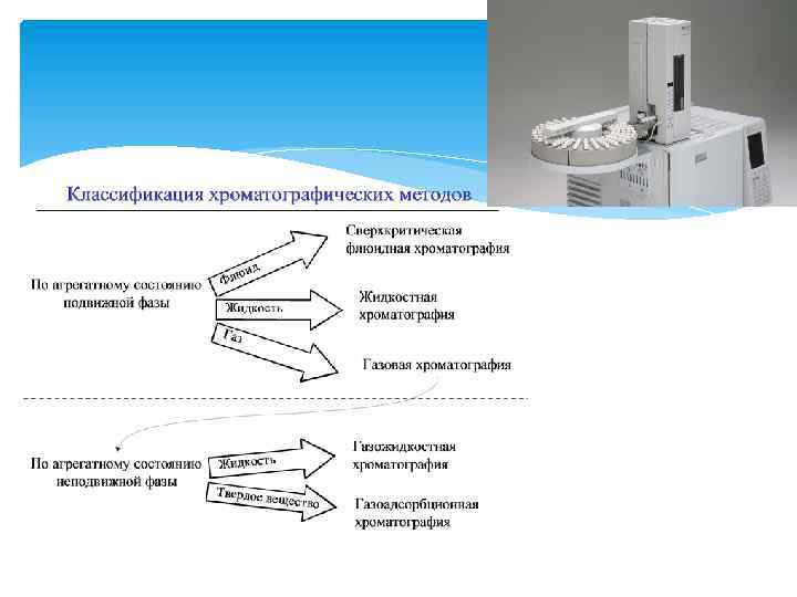 Классификация хроматографических методов Неподвижная фаза – твердое тело (адсорбционная хроматография) 1. Жидкостно-адсорбционная хроматография: подвижная фаза – жидкость (разделение нефтяных фракций на ароматическую и нафтенопарафиновую части на силикагеле) 2. Газо-адсорбционная хроматография: подвижная фаза – газ (разделение газообразных углеводородов на твердых адсорбентах, разделение газов на цеолитах) Неподвижная фаза – жидкость на твердом носителе (распределительная хроматография) 1. Жидкостно-распределительная хроматография: подвижная фаза – жидкость (хроматография на бумаге, хроматография в тонком слое адсорбента) 2. Газо-жидкостная хроматография: подвижная фаза - газ (пар).