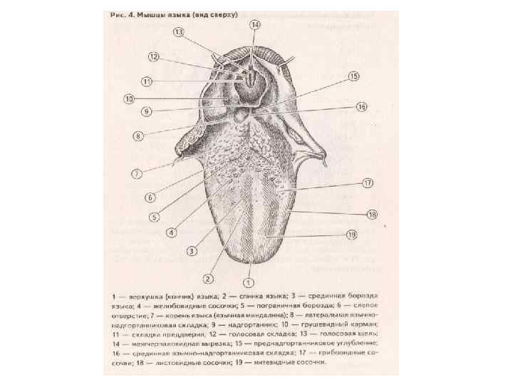 • Язык представляет собой массивный мышечный орган, который не имеет сухожилий. • Передняя часть языка подвижна, в которой различают кончик, передний край, боковые края и спинку. • Задняя часть языка фиксирована и носит название корня языка.