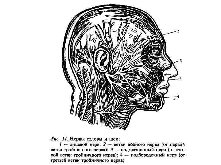 Основную роль в иннервации мышц периферического речевого аппарата играют лицевой, тройничный, языкоглоточный, блуждающий, подъязычный нервы. • VII - Лицевой нерв является двигательным. Его ветви височные, скуловые, щечные, краевая ветвь нижней челюсти и шейная - иннервируют все мимические мышцы лица, кожу головы, затылочную часть, мышцы ушной раковины, частично мышцы дна полости рта и подкожную мышцу шеи. • V - Тройничный нерв является смешанным: он содержит двигательные и чувствительные волокна. Тройничный нерв иннервирует кожу головы и лица.