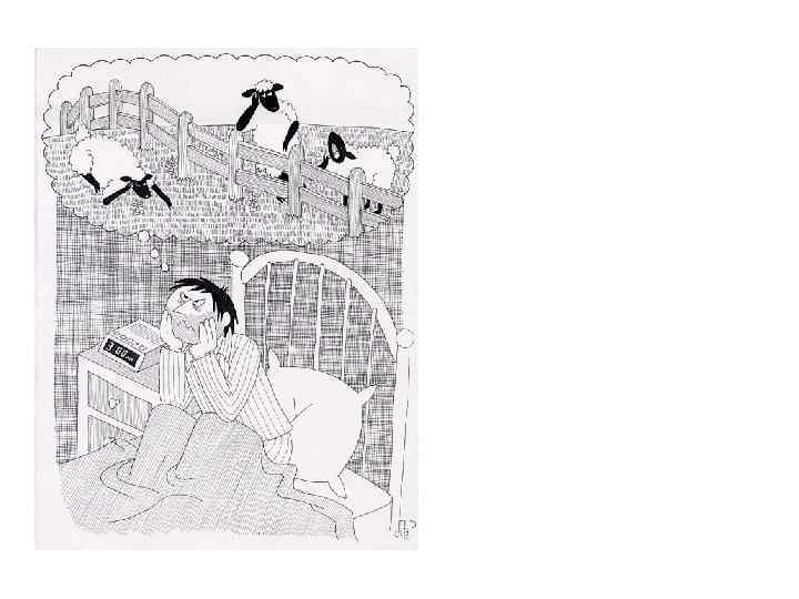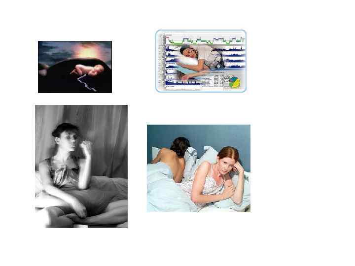 Патология сна • Инсомнии (диссомнии) — нарушения ночного сна. • Пример: бессонница. • Причины: неврозы, психозы, органические поражения мозга (энцефалит, эпилепсия), соматические заболевания.