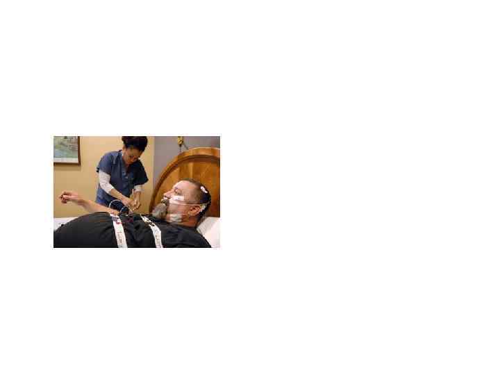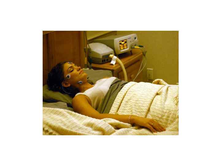 Полисомнография • • • Электроэнцефалограмма (активность мозга). Электроокулограмма (движения глаз). Электромиограмма (тонус подбородочных мышц). Движения нижних конечностей. Дыхательные движения грудной клетки и брюшной стенки. Дыхание ? ? . Насыщение крови кислородом. Постоянная видеозапись в течение всего сна пациента. Положение тела. Храп.