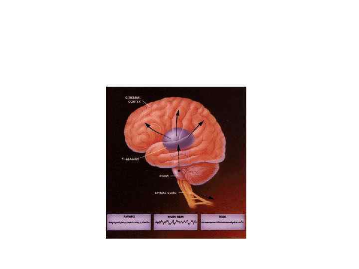 Ретикулярная теория сна и бодрствования • В ретикулярной формации ствола мозга находится множество нейронов, аксоны которых идут почти ко всем областям головного мозга (кроме неокортекса). • В конце 1940 -х годах Моруцци и Мэгуном было обнаружено, что высокочастотное раздражение ретикулярной формации ствола мозга кошек приводит к их мгновенному пробуждению. • Повреждение ретикулярной формации вызывает постоянный сон, перерезка же сенсорных трактов такого эффекта не дает.