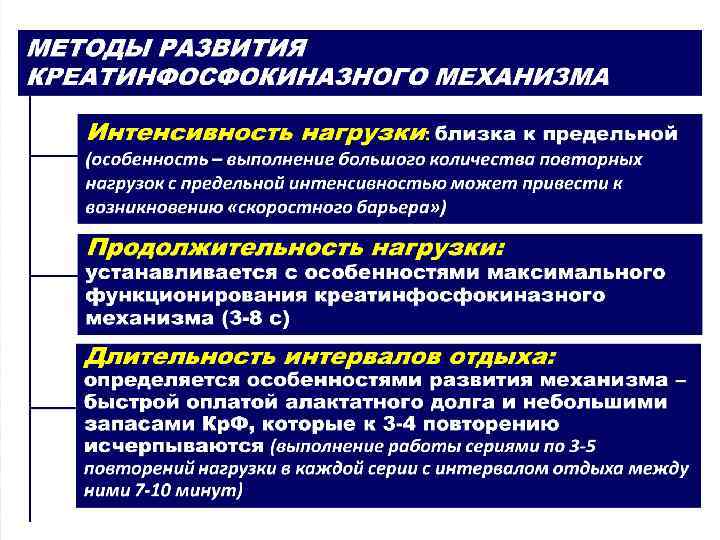 Так, фаза суперкомпенсации креатинфосфата достигается через несколько минут отдыха после нагрузки, приводящей к существенному снижению его уровня. Для достижения выраженной суперкомпенсации содержания гликогена в мышцах требуется не менее 2– 3 суток, к этому моменту уровень креатинфосфата уже вступит в фазу утраченной суперкомпенсации. Для восстановления же структур клеток, разрушенных в ходе тренировок, может потребоваться еще больший период времени, в течение которого уровень гликогена в мышцах уже может вернуться к исходному уровню.