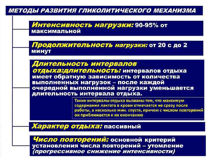 Длительность интервалов отдыха Основные критерии: • изменение работоспособности • уровень восстановления энергоресурсов В зависимости от длительности интервалов отдыха развиваются либо анаэробные, либо аэробные механизмы энергообеспечения. Интенсивность выполнения упражнения – главный фактор, определяющий развитие анаэробных и аэробных механизмов энергообеспчения.