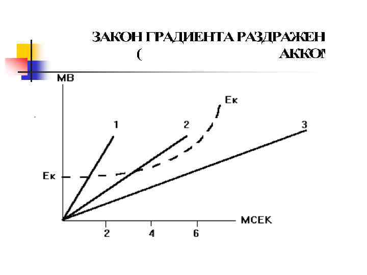 Пороговый градиент аккомодации n n Мера скорости аккомодации – наименьшая крутизна нарастания силы раздражения, при которой ткань еще способна ответить возбуждением на данный раздражитель. Механизм аккомодации – инактивация натриевой и повышение калиевой проницаемости во время медленно нарастающей деполяризации мембраны.