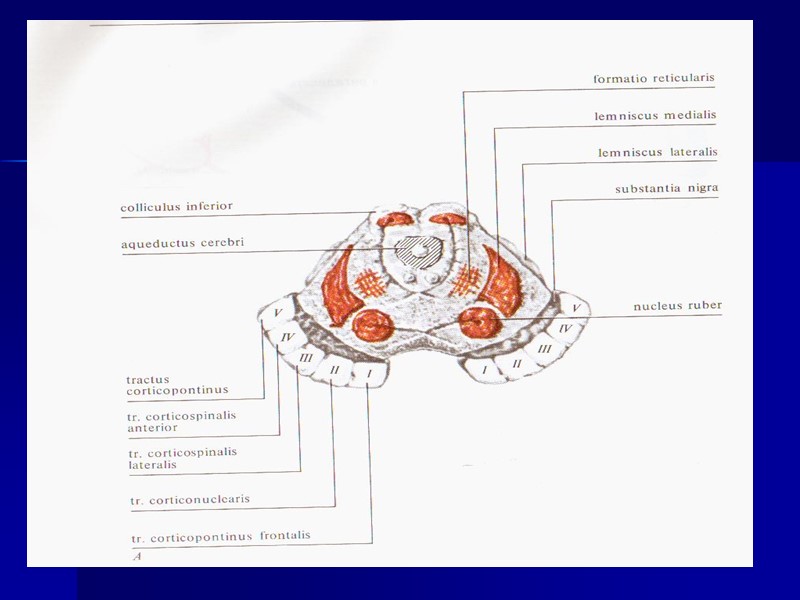 Сопақша мидың көлденең кескіні Поперечный разрез продолговатого мозга (на двух уровнях) 1 - тонкое ядро, 2 - клиновидное ядро, 3 - добавочное клиновидное ядро, 4 - текто-спинальный путь, 5 - пирамидный пучок, 6 - медиальная петля, 7 - внутренние дугообразные волокна, начинающиеся от тонкого и клиновидного ядер, формируют медиальную петлю, 8 - перекрест медиальных петель, 9 - медиальный продолговатый пучок, 10 - ретикулярная формация, 11, 12 - медиальное и заднее добавочные оливные ядра, 13 - нижнее оливное ядро