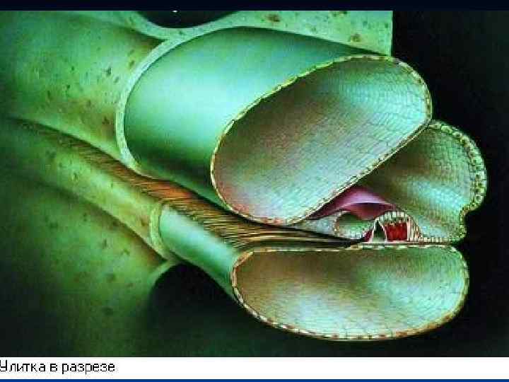 «Струны» основной мембраны n n Рецепторные волосковые клетки образуют кортиев орган, находящийся в улитке внутреннего уха на основной мембране , длина которой около 3, 5 см. Она состоит из 20000 - 30000 волокон. Эти волокна напоминают струны музыкальных инструментов. Начиная от овального отверстия, длина волокон постепенно увеличивается (примерно в 12 раз), в то время как толщина их постепенно уменьшается (примерно в 100 раз).