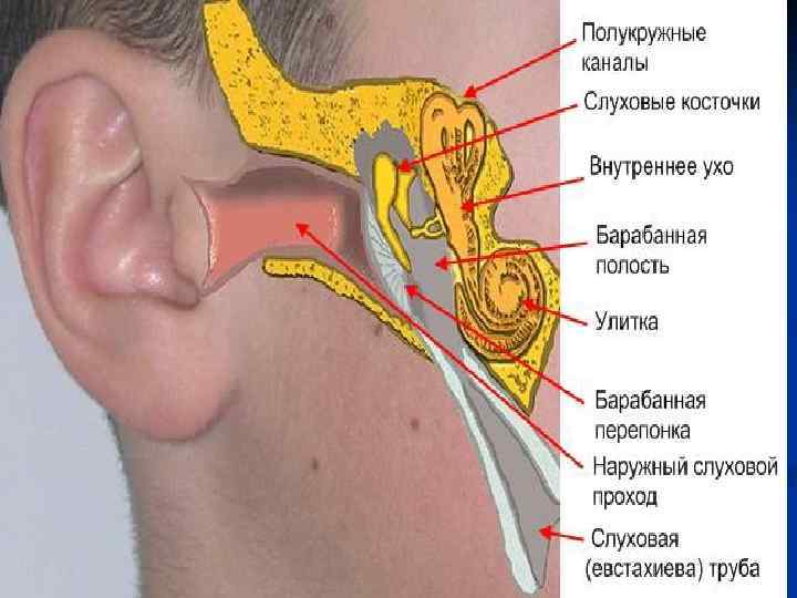 1 – ушная раковина; 2 – наружный слуховой проход; 3 – барабанная перепонка; 4 – молоточек; 5 – наковальня; 6 – стременная мышца; 7 – стремечко; 8 – полукружные каналы; 9 – овальный мешочек; 10 – равновесное пятно и равновесные гребни; 11 – эндолимфатический проток и мешочек в водопроводе преддверия; 12 – круглый мешочек с равновесным пятном; 13 – свод улитки; 14 – перепончатая улитка; 15 – кортиев орган; 16 – барабанная лестница; 17 – лестница преддверия; 18 – водопровод улитки; 19 – окно улитки; 20 – мыс; 21 – костная слуховая труба; 22 – чечевицеобразная косточка; 23 – напрягатель барабанной перепонки; 24 – барабанная полость