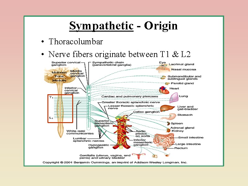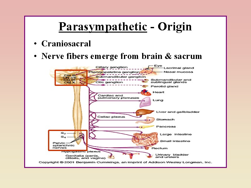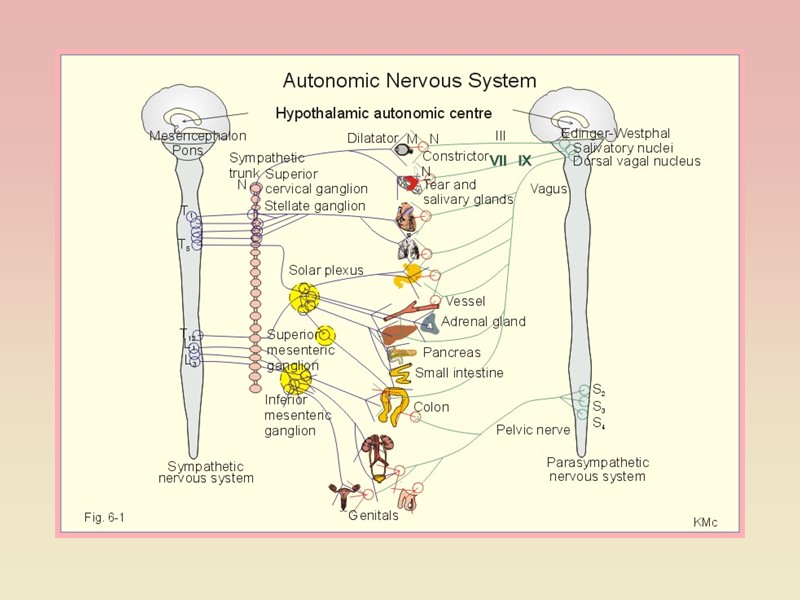 Відділи автономної нервової системи центри парасимпатичного відділу розташовані в бульбарному відділі головного мозку та сакральному відділі спинного мозку (краніальні – у ядрах Ш, VII, IX, X чер.-м.н., сакральні – у бокових рогах трьох сегментів крижового відділу сп.м.- S2-S4 – нисхідна частина ободової кишки, тазові органи (пряма кишка, сечовий міхур, статеві органи), центри симпатичного відділу – у торако-люмбальному відділі спинного мозку (T1 (C8) –L5);
