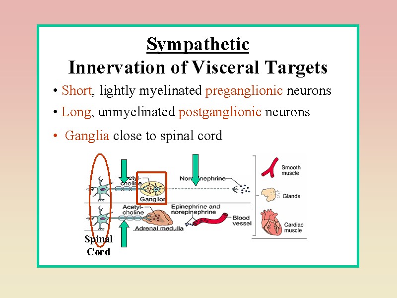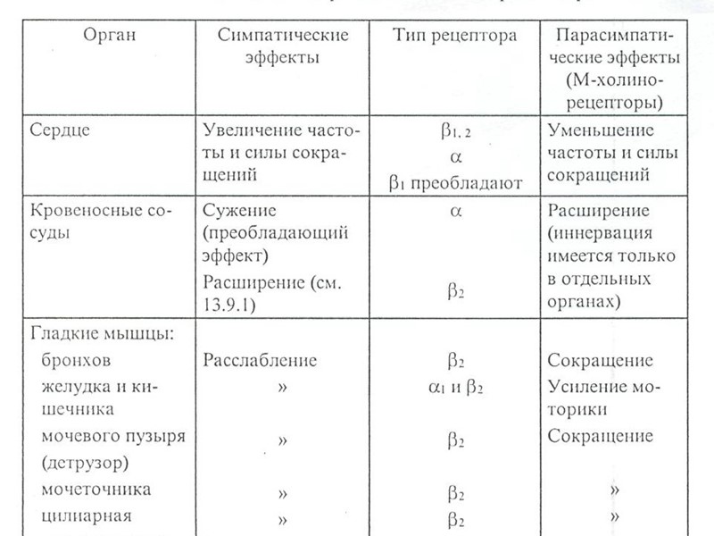 У більшості органів є два типи адренорецепторів, хоч різне їх співвідношення, у декотрих - лише один з рецепторів. Зокрема, з’єднання симпатичного медіатора з α1-адренорецепторами у арт.стінці супроводжується звуження артеріол, з β2 - їх розширенням. У серці – через β1—збільшення ЧСС, розширення бронхів – через β2. У кишці і через α- і β- - адренорецептори гальмуються скорочення. Деякі органи мають в основному парасимпатичну інервацію (сечовий міхур), а деякі органи – потові залози, м’язи, що піднімають волосся, селезінка, наднирники – лише симпатичну. У наднирниках мозковий шар інервується лише прегангліонарними волокнами.