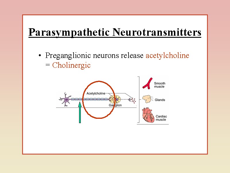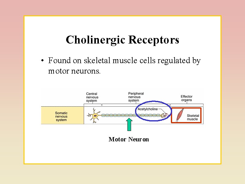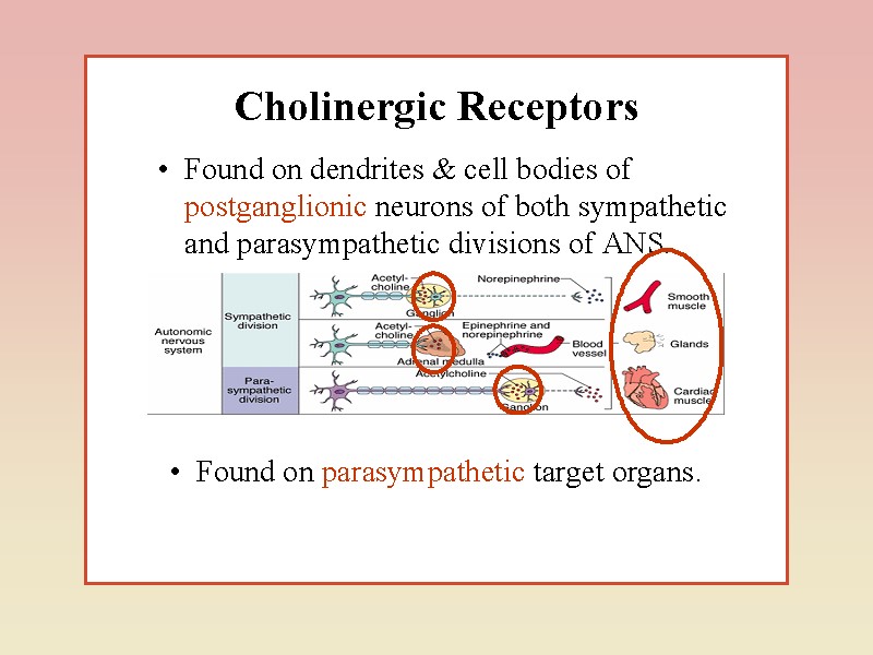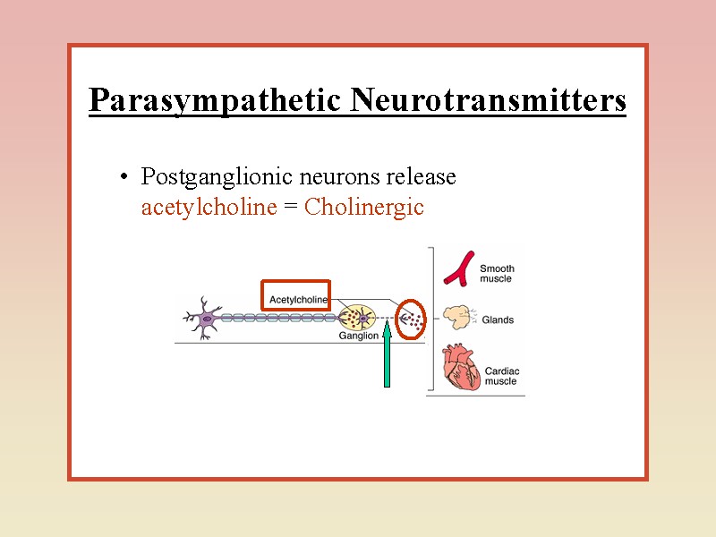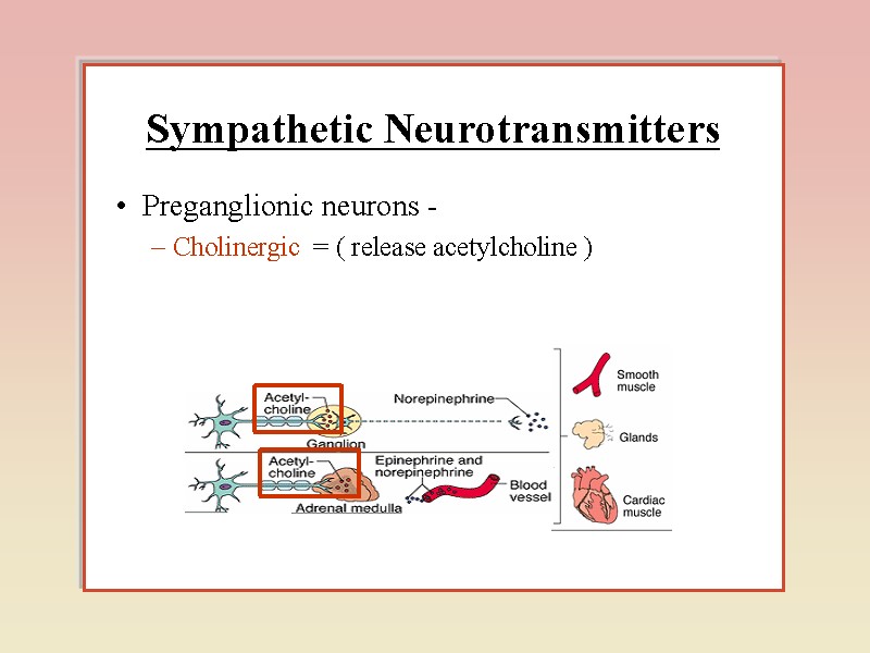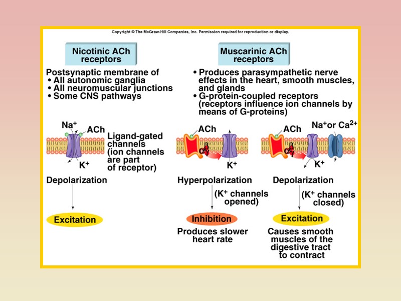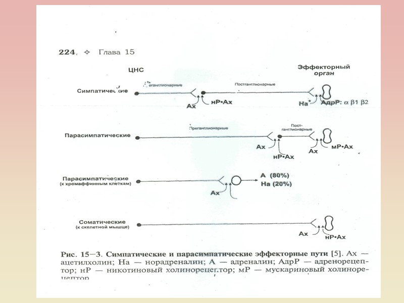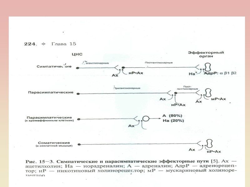 У АНС нараховується більше десятка медіаторів – ацетилхолін, норадреналін, серотонін та інші біогенні аміни, АТФ і амінокислоти. у зв'язку з цим нейрони, що їх утворюють, називають холінер-гічними, адренергічними, серотонінергічними, пуринергічними, і т.п. Існує також багато типів гіпоталамічних нейронів, які продукують нейрогормони. Дія АХ може бути відтворена за допомогою фармакологічних препаратів. Так, нікотин, викликає подібний ацетилхоліну ефект при дії на постсинаптичну мембрану постгангліонарного нейрона, токсин мухомора мускарин – на мембрану ефекторного органа. Така різниця в реакціях стала основою для виділення двох типів холікорецепторів: нікотинового (Н-холінорецептора) і мускаринового (М-холінорецептора).
