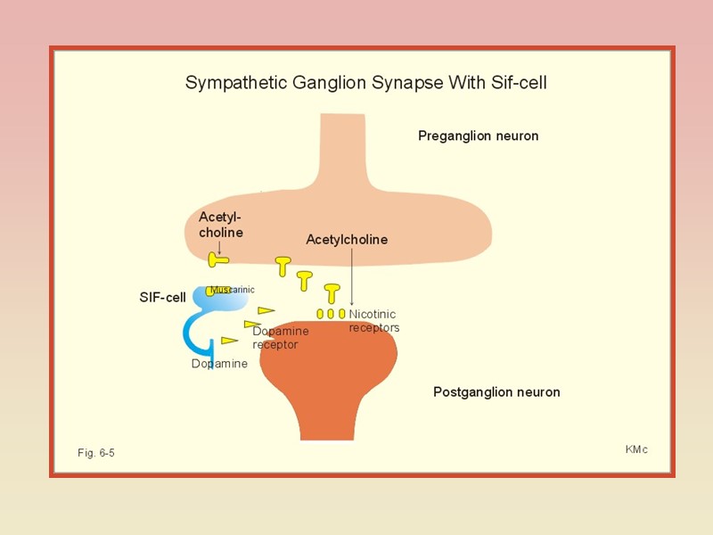 Медіатори постгангліонарних симпатичних волокон НА(90%), А(7%), ДА(3%). Синтезується у термінальних симпатичних закінченнях з тирозину (лише 1% - у тілі нейрона). КА, як і інші катехоламіни, виділяються при збудженні нервовим закінченням шляхом везикулярного екзоцитозу, що реалізується за участю Са+2, який проникає у пресинаптичне закінчення через потенціалзалежні Са+2-канали. Виведення Са+2 з нервового закінчення після його збудження здійснюється Са+2-помпою. При збудженні постгангліонарних симпатичних нервових волокон разом з НА виділяється комедіатори (модулятори) - нейропептиди (соматостатин, метенкефалін, АТФ). До аксонів нейронів, медіатором яких є норадреналін, належать постгангліонарні симпатичні волокна, що інервують судини та внутрішні органи, нейрони МСНС, нейрони в ЦНС, що локалізуються в сірій речовині середнього мозку, смугастому тілі, базальних гангліях, у висхідних та нисхідних адренергічних шляхах.