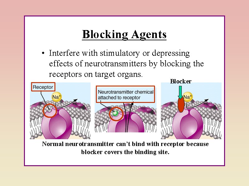 Речовини, що відтворюють ефекти подразнення постгангліонарних симпатичних нейронів, одержали назву адреноміметики; речовини, що попереджують цю дію – адреноблокатори і симпатолітики. – Адреноміметики прямої дії (безпосередньо впливають на адренорецептори, збуджуючи їх): норадреналін (діє на β-адренорецептори), адреналін (α, β), ізадрин (β, мезатон (β), нафтизин (β). – Адреноміметики непрямої дії (пригнічують дію фермента моноаміноксидази (МАО-аза), що призводить до накопичення адреналіну в нервових закінченнях): ефедрин (а, β), фенамін (а, β) – Адреноблокатори (блокують адренорецептори): α-адреноблокатори; фентоламін, тропафен; β-адреноблокатори; корданум, атенолол (кардіоселективні), анаприлін, транзикор, віскен (загальної дії), кордарон (змішаної дії). – Симпатолітики (зменшують вміст медіатора в нервових закінченнях): октадин, метил-дофа, резерпін, раунатин.