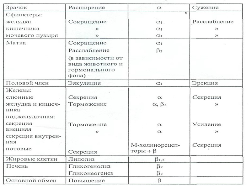 Активація α-АР викликає: вазоконстрикцію судин шкіри, слизових оболонок, нирок, органів черевної порожнини, легень, мозку, скелетних м’язів. Скорочення гладких м’язів, що утворюють сфінктери травної системи (кардіальний, пілоричний, ілеоцекальний), збудження циліарного м’язу та його розширення. Активація β-АР: викликає вазодилятацію судин скелетних м’язів, коронарних, легень, органів черевної порожнини, головного мозку; Проявляється підсиленням частоти, сили скорочення та швидкості проведення збудження атиповими та типовими кардіоміоцитами; супроводжується розслабленням циліарного м’яза, гладких м’язів жовчних шляхів, зниженням тонусу сечового міхура.