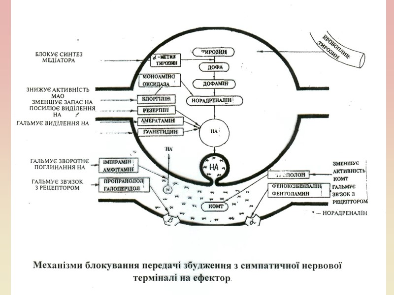 Речовини, що відтворюють ефекти подразнення постгангліонарних симпатичних нейронів, одержали назву адреноміметики; речовини, що попереджують цю дію – адреноблокатори і симпатолітики. – Адреноміметики прямої дії (безпосередньо впливають на адренорецептори, збуджуючи їх): норадреналін (діє на β-адренорецептори), адреналін (α, β), ізадрин (β, мезатон (β), нафтизин (β). – Адреноміметики непрямої дії (пригнічують дію фермента моноаміноксидази (МАО-аза), що призводить до накопичення адреналіну в нервових закінченнях): ефедрін (а, β), фенамін (а, β) – Адреноблокатори (блокують адренорецептори): α-адреноблокатори; фентоламін,тропафен; β-адреноблокатори; корданум, атенолол (кардюселективні), анаприлін, транзикор, віскен (загальної дії), кордарон (змішаної дії). – Симпатолітики (зменшують вміст медіатора в нервових закінченнях): октадин, метилдофа, резерпін, раунатин.