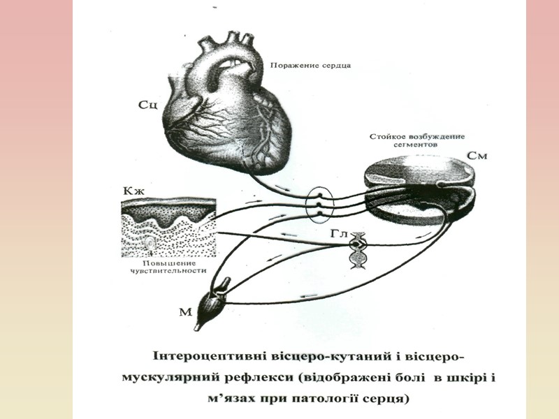 Класифікація вегетативних рефлексів (за структурно-функціональною організацією) 1. Центральні (різного рівня) та периферичні рефлекси (інтра- та екстраорганні). П. 1. Вісцеро-вісцеральні: - зміна діяльності шлунка при наповненні тонкої кишки; - гальмування діяльності серця при подразненні Р-рецепторів шлунка (рефлекс Гольца). Рецептивні поля таких рефлексів локалізовані у різних органах. 2. Вісцеро-соматичні – зміна соматичної діяльності при збудженні сенсорних рецепторів ВНС, наприклад, скорочення м’язів, рух кінцівок при сильному подразненні рецепторів ШКТ. 3. Сомато-вісцеральні. Рефлекс Даніні Ашнера – зменшення ЧСС при натискуванні на очні яблука, зменшення сечовипускання при больовому подразненні шкіри. Прикладом, соматовісцерального ресфлексу є знеболююча дія теплої грілки на зону шкіри, на яку проектується уражений орган. 4. Дермато-вісцеральні. Ш. За рецепторами рефлексогенних зон : інтерорецептивні, екстерорецептивні, пропріоцептивні.