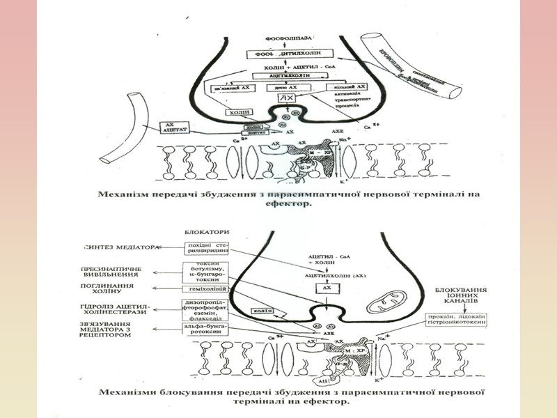 Фармакологічні препарати, які впливають на ефекторний орган аналогічно постгангліонарному парасимпатичному нейрону, одержали назву парасимпатоміметиків. – М-холіноміметики (збуджують М-холінорецептори): пілокарпін, ацеклідин. – Н-холіноміметики (збуджують Н-холінорецептори): цитизин. Антихолінестеразні (блокують холінестеразу, при цьому ацетилхолін,що виділяється, не руйнується і його ефект підсилюється й пролонгується; ефективніше діють на органи з М-холінорецепторами): прозергін, оксазил - діють переважно на нервово-м'язову передачу; фосфакол, езерин – діють на ЦНС. Існують речовини (холінолітики), які вибірково блокують синаптичну передачу в холінергічних синапсах. – Блокатори М-холінорецепторів: атропін і скополамін. – Блокатори Н-холінорецепторів: а) гангліоблокатори - бензогексоній, пентамін; б) курареподібні (м'язові релаксанти, взаємодіють з Н-холінорецепторами скелетних м'язів) – тубокурарину хлорид, диплацин, дитилін. Окрім медіаторної ролі, АХ володіє і загально-біологічною дією. Він пригнічує роботу серця, підсилює легеневу вентиляцію, скорочує м'язи бронхів, підсилює шлунково-кишкову перистальтику, активує секрецію травних залоз. Унаслідок короткочасності ефекту сам АХ не застосовується, але використовуються його похідні метахолін і карбамілхолін.
