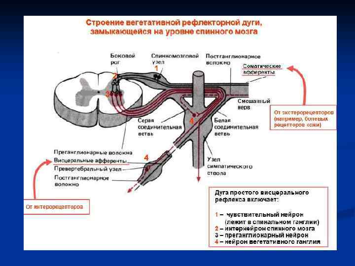 Висцеральные чувствительные нейроны спинномозгового ганглия А — центральные отростки псевдоуниполяров заканчиваются на вставочных нейронах, и преганглионарных нейронах симпатического и парасимпатического отделов нервной системы. Б — потенциал действия, возникший на периферии, вызывает высвобождение нейромедиатора из центрального и периферического отростка клетки.
