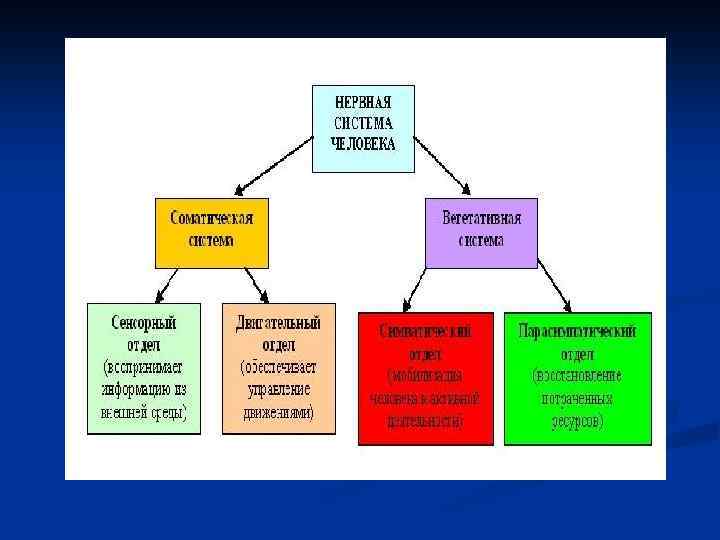 Функция симпатического и парасимпатического отделов нервной системы Парасимпатическая нервная система 1, 2, 4, 5 - сужение; 3 - усиление секреции; 6 - замедление; 7, 13 - расслабление; 8 - уменьшение; 9, 11 - усиление моторики; 10 - уменьшение секреции; 12 – сокращение Симпатическая нервная система 14, 15, 17, 18 - расширение; 16 - снижение секреции; 19 - ускорение и усиление сокращения; 20 - сокращение; 21 - усиление; 22, 24 - ослабление моторики; 23 - усиление секреции; 25 - расслабление; 26 - возбуждение A - сосуды головного мозга; B - зрачок; C - слюнные железы; D - периферийные сосуды; E - бронхи; F - сердце; G - мышца, поднимающая волос; H - потоотделение; I - желудок; J - печень; K - почка; L - надпочечник; M - кишечник; N - мочевой пузырь; O - половые органы