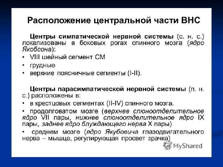 Метасимпатическая нервная система n n n n 1. Она иннервирует только внутренние органы, наделенные собственной моторной активностью; в сфере ее иннервации находятся гладкая мышца, всасывающий и секретирующий эпителий, локальный кровоток, местные эндокринные элементы, иммунные структуры. 2. Она получает синаптические входы от симпатической и парасимпатической систем и не имеет прямых синаптических контактов с эфферентной частью соматической рефлекторной дуги. 3. Наряду с общим висцеральным афферентным путем она имеет собственное сенсорное звено. 4. Она не находится в антагонистических отношениях с другими частями нервной системы. 5. Представляя истинно базовую иннервацию, она обладает гораздо большей, чем симпатическая и парасимпатическая нервная система, независимостью от ЦНС. — 6. Органы с разрушенными или с выключенными с помощью ганглиоблокаторов метасимпатическими путями утрачивают присущую им способность к координированной ритмической моторной и другим функциям. 7. Метасимпатическая нервная система имеет собственное медиаторное звено.