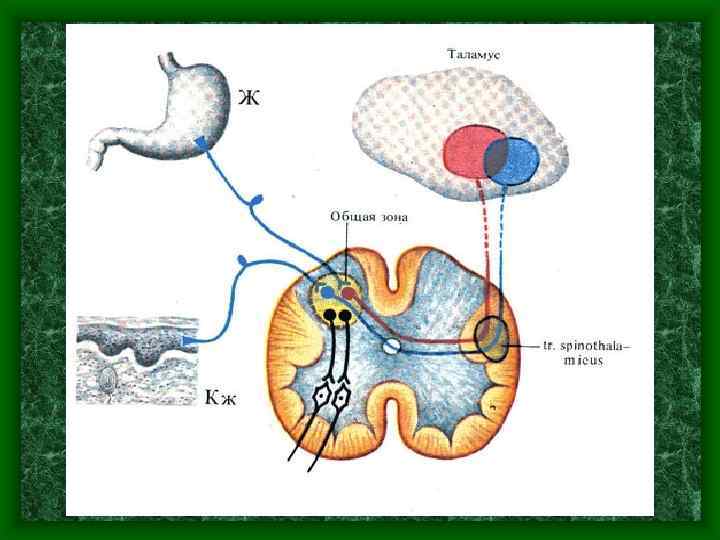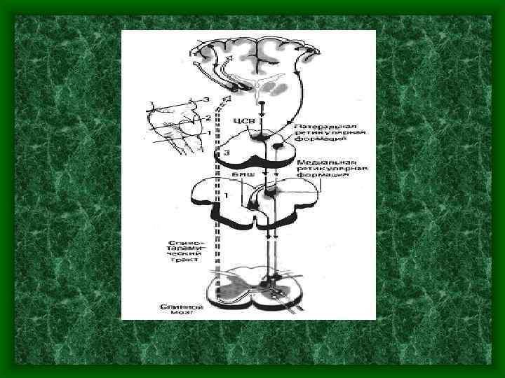 Ассоциатив. обл. лимбическая кора Thalamus n. medialis 2 2 – палеоспиноталамический путь Гипоталамус РФ 1 SI-SII 1 –неоспино. VPL таламический Thalamus путь Аспарагиновая к-та кожа Аδ С в-во Р n. Vagus 70% С Внут. орг.