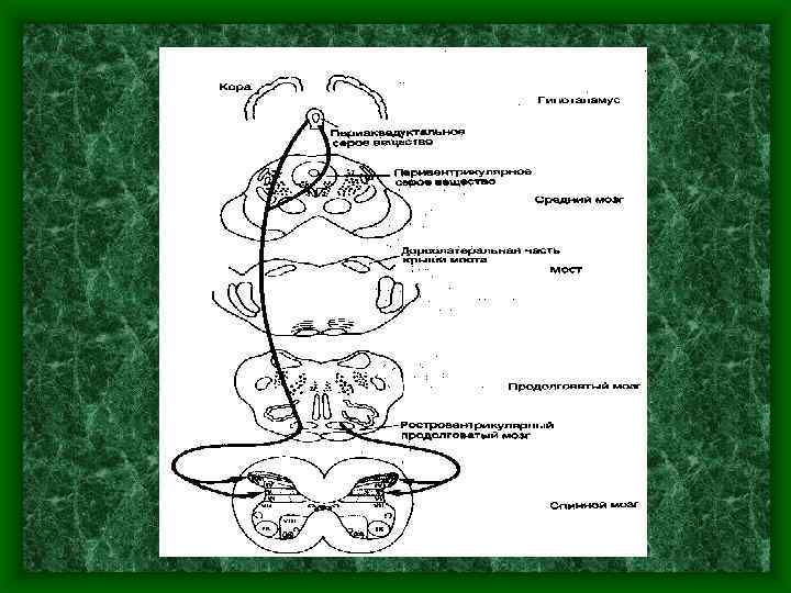 Антиноцицептивная система Гигантоклеточное ядро РФ серотонин Сеть нейронов спинного мозга, выделяющих эндоопиаты Тормозятся афферентные ноцицептивные входы и нейроны заднего рога