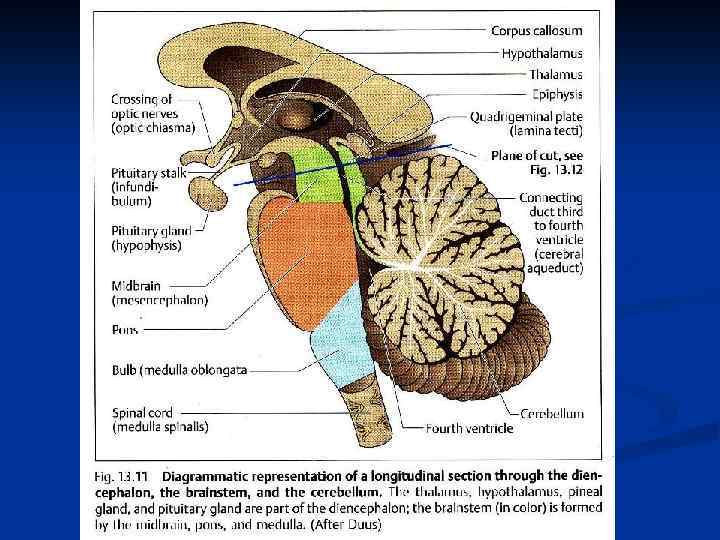 Промежуточный мозг ● Таламус (несколько десятков ядер): центральная передаточная станция сенсорных трактов (боль, температура, давление, прикосновение) на пути к коре, а также других трактов (от мозжечка, от базальных ядер и др. ) на пути к коре ● Метаталамус (медиальное и латеральное коленчатые тела): центральная передаточная станция для зрительных и слуховых путей на пути к коре ● Гипоталамус (несколько десятков ядер): центр, управляющий деятельностью вегетативной нервной системы (например, поддержанием температуры, водного баланса, питанием), а через гипофиз – всей эндокринной системой ● Гипофиз: основной орган, управляющий эндокринной системой (гормоны гипофиза управляют деятельностью других эндокринных желез – надпочечников, щитовидной железы, гонад и др. ) ● Эпиталамус (шишковидная железа, =эпифиз): эндокринный орган, участвующий в управлении суточным ритмом