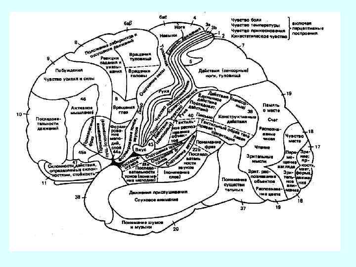 1, 2 и часть 3 – ядро кожного анализатора. 1 и 3 – проекция экстерорецепторов в соответствии с их распределением в коже. Письменная и устная речь. 3 и 4 – ядро двигательного анализатора. 4 - проекция проприорецепторов в соответствии с расположением мускулатуры. Письменная и устная речь. 5 – Кожный анализатор. Каждая колонка клеток отвечает за восприятие преимущественно одного вида чувствительности (например, одна из колонок реагирует на прикосновение к коже, другая — на движение конечности в суставе). 6 – Письменность и речь. Тонкие движения руки при начертании букв. Двигательный анализатор. 7 – Кожный анализатор. 8 – Двигательный анализатор. 9 – Третичная зона. Профессиональные навыки. Мышление, планирование и целенаправленность действий. Письменная и устная речь. 10 – Третичная зона. Мышление, планирование и целенаправленность действий. 10 – Третичная зона. Письменная и устная речь 17 – проекция сетчатки. Письменная и устная речь. 17, 18, 19 – ядро зрительного анализатора, функции восприятия зрительных образов также распределены по колонкам (например, одна из колонок воспринимает движение предмета в горизонтальной плоскости, соседняя — в вертикальной и т. п. ) 20, 21, 22 – ядро слухового анализатора (см. также 41, 42). В поле 22 при участии полей 41 и 42 происходит слуховое восприятие речи. При разрушении поля 22 теряется способность понимать слова. 37 – Третичная зона. 39 – Зрительное восприятие письменных знаков. При поражении этого поля утрачивается способность слагать из букв слова и фразы. 39 и 40 - Третичная зона. 40 – Регулирование выработанных в течение жизни и направленных к определённой цели движений. 41 – проекция Кортиева органа. Письменная и устная речь. 41, 42 – ядро слухового анализатора (см. также 20, 21, 22). 44, 45 - Третичная зона. Речедвигательный анализатор. 46 – Третичная зона. Письменная и устная речь.