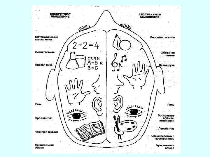 С функциями левого и правого полушария у человека связаны два типа мышления — абстрактно-логическое и пространственнообразное. • По В. Ротенбергу: • Вербальное и невербальное (поскольку абстрактно-логическое мышление левого полушария в отличие от образного мышления правого полушария базируется на способности к продуцированию речи); • Аналитическое и синтетическое (поскольку с помощью логического мышления в левом полушарии осуществляется анализ предметов и явлений, тогда как образное мышление в правом полушарии обеспечивает цельность восприятия); • Дискретное и симультанное (поскольку с помощью логического мышления левое полушарие осуществляет ряд последовательных операций, тогда как с помощью образного мышления правое полушарие приобретает способность к одномоментному восприятию и оценке объекта).