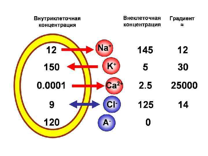 Потенциал покоя – это разность потенциалов между наружней и внутренней поверхностями мембраны. • Формируется за счет: Ионной ассиметрии – разность концентрации ионов внутри клетки и вне её; 1. Различной проницаемости мембраны для разных ионов.