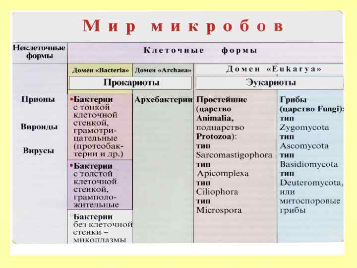 Место микробов среди живых существ ЭУКАРИОТЫ ПРОКАРИОТЫ НЕКЛЕТОЧНЫЕ РАСТЕНИЯ ГРИБЫ ЖИВОТНЫЕ ПРОСТЕЙШИЕ АКТИНОМИЦЕТЫ СПИРОХЕТЫ БАКТЕРИИ МИКОПЛАЗМЫ РИККЕТСИИ ХЛАМИДИИ ВИРУСЫ