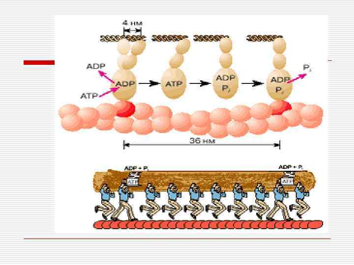 Механизм мышечного сокращения Сокращение мышечных волокон обеспечивается кооперативной работой большого количества молекул миозина, собранных в толстые нити. Движение пучка молекул миозина вдоль нити актина можно сравнить с перетаскиванием бревна большой группой работников, из которых лишь небольшая часть тружеников (10 -15%) опирается ногами на землю, в то время как остальные работники висят на бревне, не касаясь земли. Подобно мостикам миозина, работники периодически меняются ролями, однако в каждый момент времени активно работает лишь небольшая часть тружеников, несущих бревно вместе с висящими на нем товарищами.