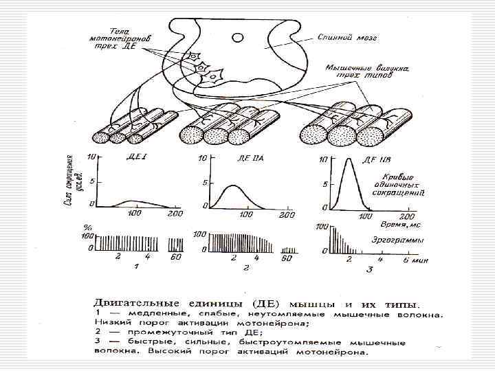 Типы двигательных единиц ДЕ Медленные неутомляемые ДЕ (I) o o o Быстрые легко утомляемые ДЕ (II-В) Быстрые устойчивые к утомлению ДЕ (II-А) ДЕ (I) имеют наименьшие величины мотонейронов с наиболее низкими порогами активации, малую скорость проведения возбуждения, сравнительно низкую частоту импульсации (6 -10 имп/с). Мышечные волокна медленных ДЕ развивают небольшую силу и меньшую скорость в связи с наличием меньшего количества миофибрилл; малоутомляемы, т. к. обладают развитой капиллярной сетью, содержат большое количество митохондрий с высокой активностью окислительных ферментов. Обладают существенной аэробной выносливостью, способны выполнять работу умеренной мощности длительное время без утомления. ДЕ (II-В) имеют наиболее крупные мотонейроны с высокими порогами активации, большую скорость проведения возбуждения, высокую частоту импульсации (до 25 -50 имп/с). Мышечные волокна быстрых ДЕ развивают большую силу и скорость сокращения в связи с наличием большого количества миофибрилл, большим количеством гликолитических ферментов. Не обладают развитой капиллярной сетью, содержат меньшее количество митохондрий и миоглобина, поэтому более всего приспособлены для выполнения кратковременной, но мощной работы. ДЕ (II-А) занимают промежуточное положение между ДЕ I и II-В типов. Это сильные, быстро сокращающиеся волокна, обладающие большой аэробной выносливостью благодаря присущей им возможности использовать для получения энергии как аэробные, так и анаэробные процессы.