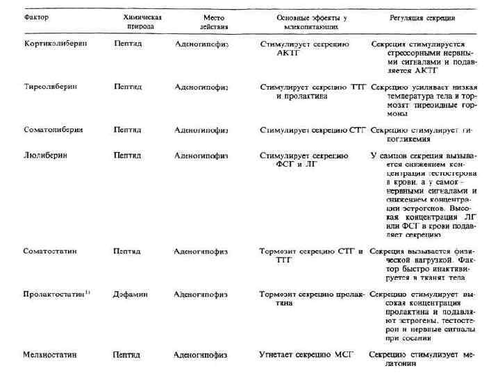 Рилизинг-гормоны • Рилизинг-факторы (либерины, статины) — класс пептидных гормонов гипоталамуса, общим свойством которых является реализация их эффектов через стимуляцию синтеза и секреции в кровь тропных гормонов передней доли гипофиза. К рилизинггормонам гипоталамуса относятся соматолиберин и соматостатин, пролактолиберин и пролактостатин, люлиберин, фоллиберин, кортиколиберин, тиролиберин, меланостатин.